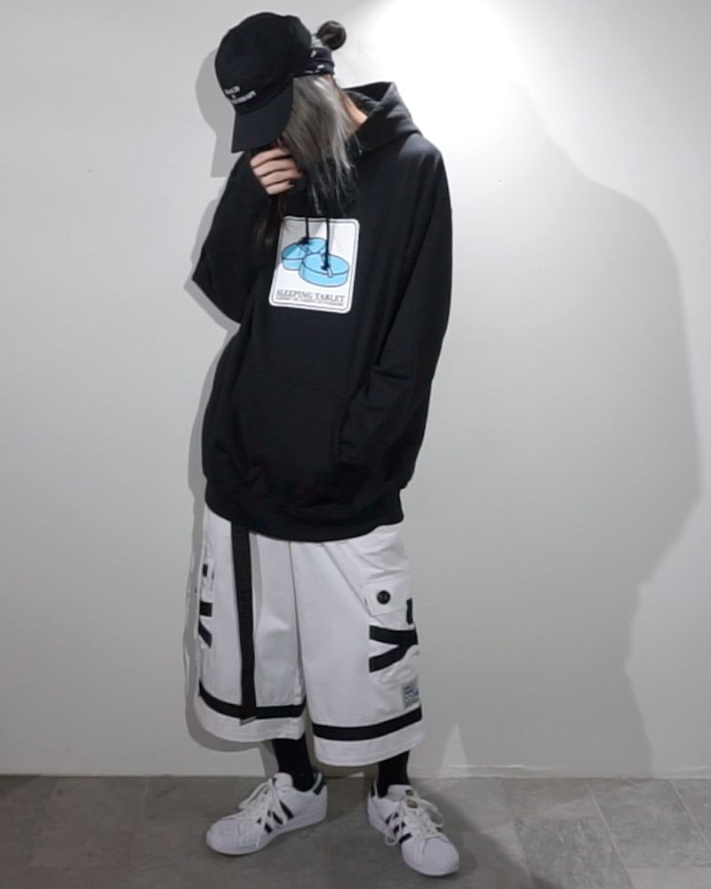 ブランドアイコンの錠剤をプリントしたプルオーバーパーカ。