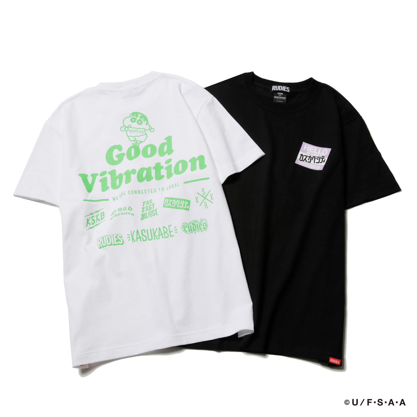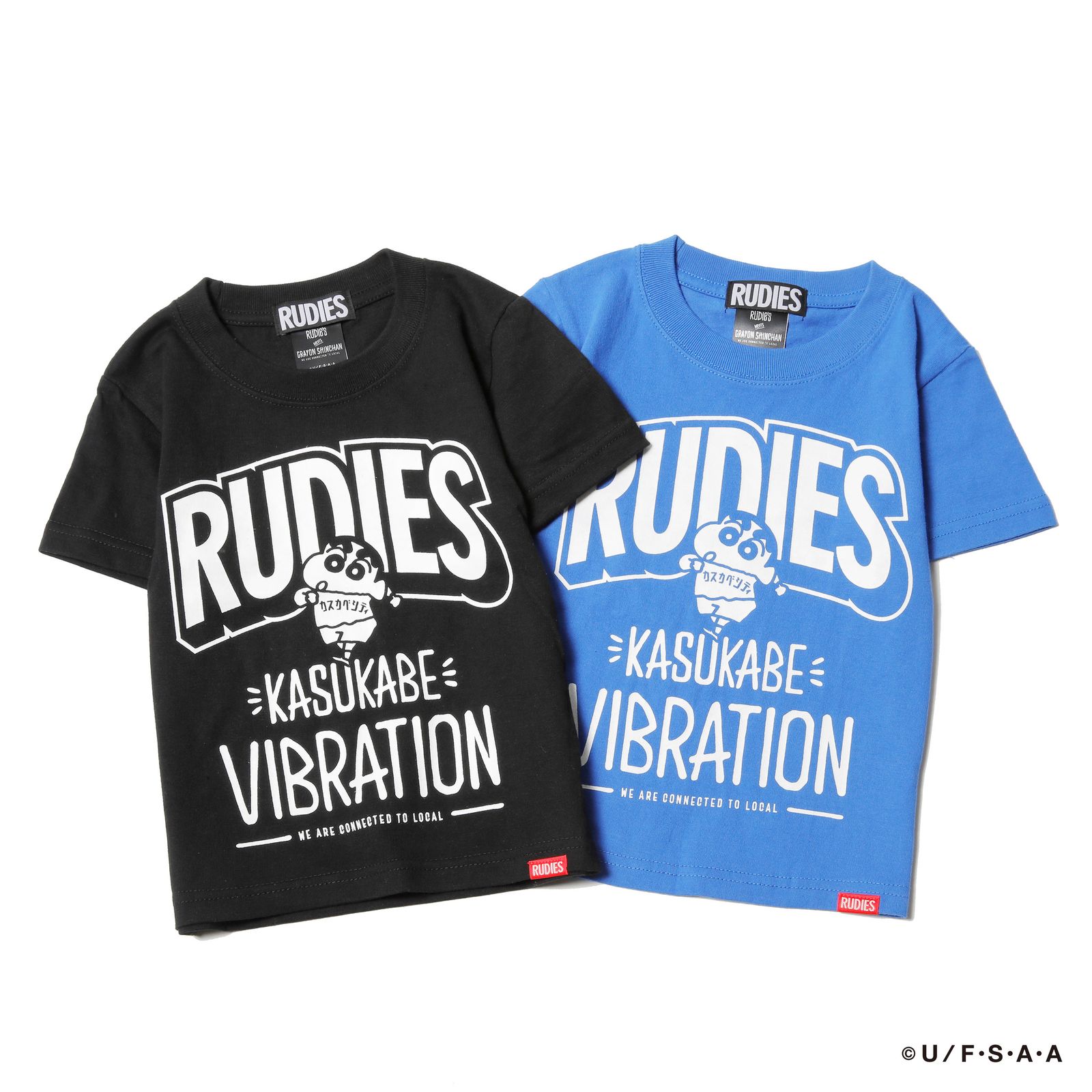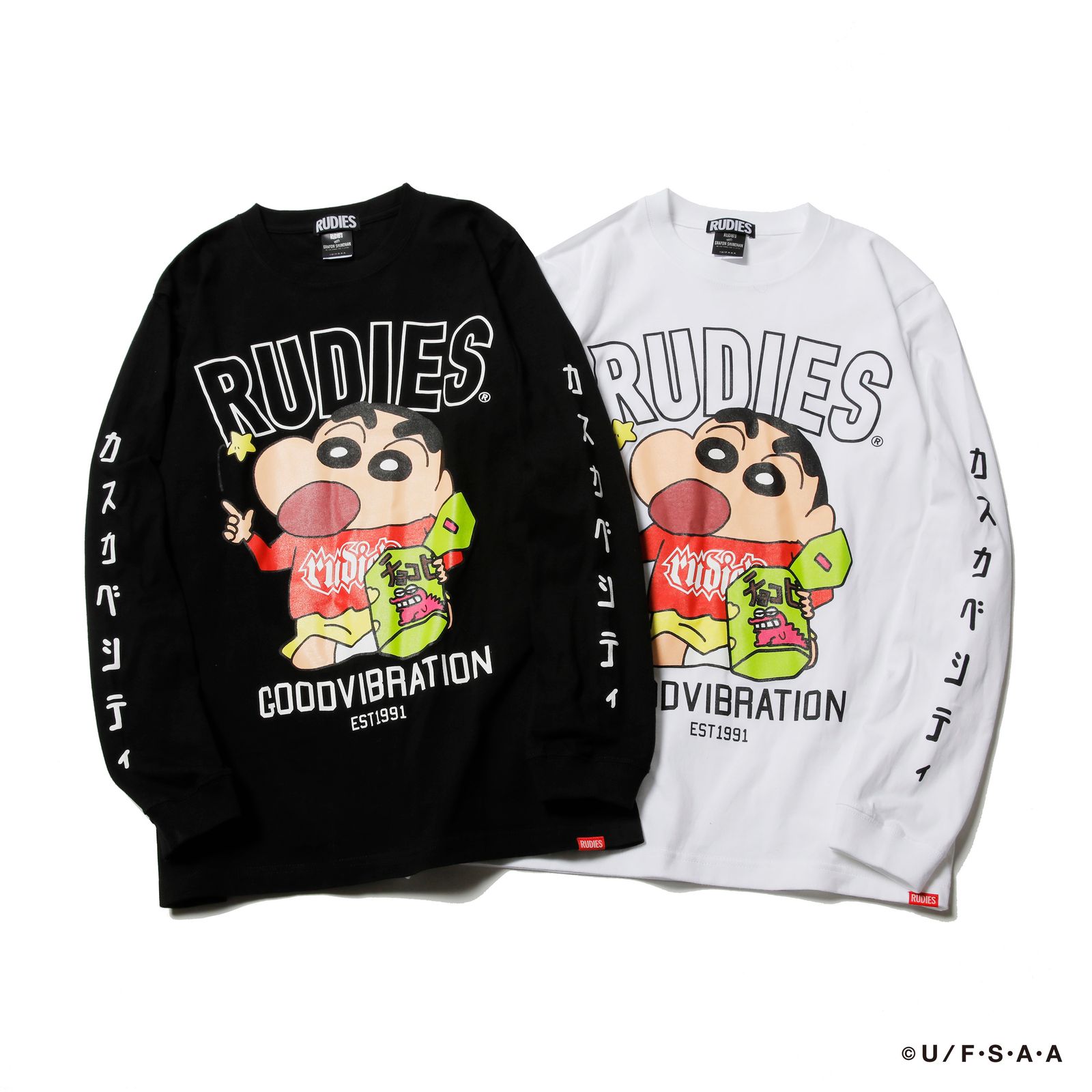 フロントには劇中にもたびたび登場する "チョコビ" を食べるしんちゃんをフルカラーで、両袖には "カスカベシティ" をプリントし、RUDIE'Sらしい1枚に仕上げました。