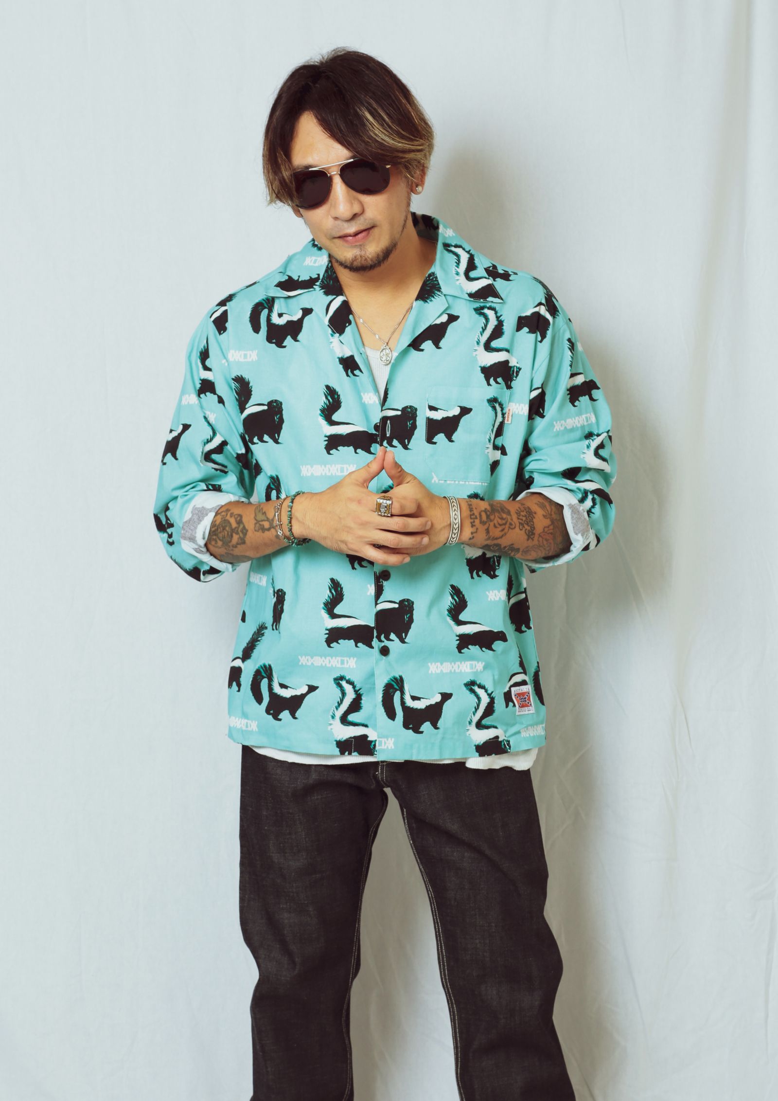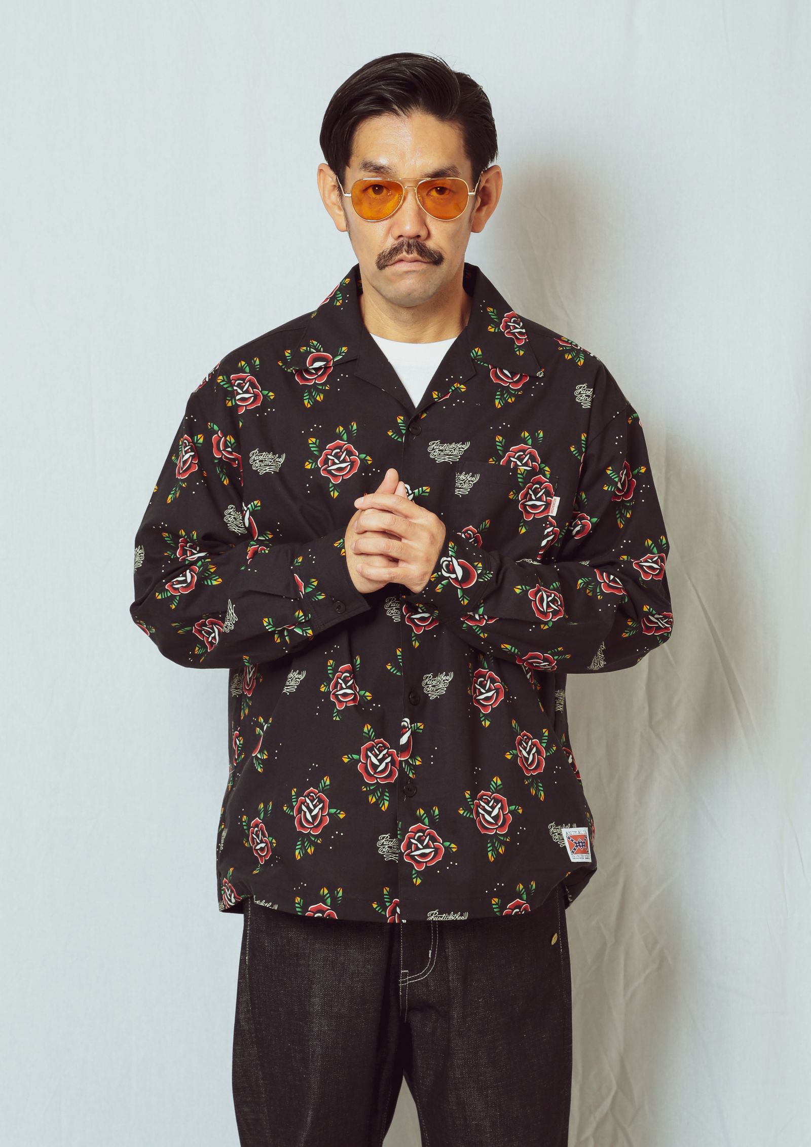 インクジェットプリントにて作ったコットン素材ルーズシルエット総柄開襟長袖シャツ。