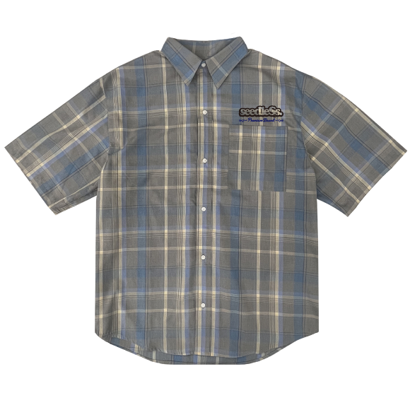 流行りのくすんだカラーのチェックシャツにブランドロゴをオン!