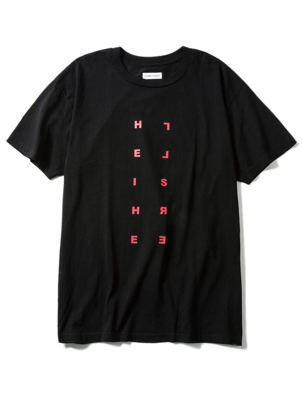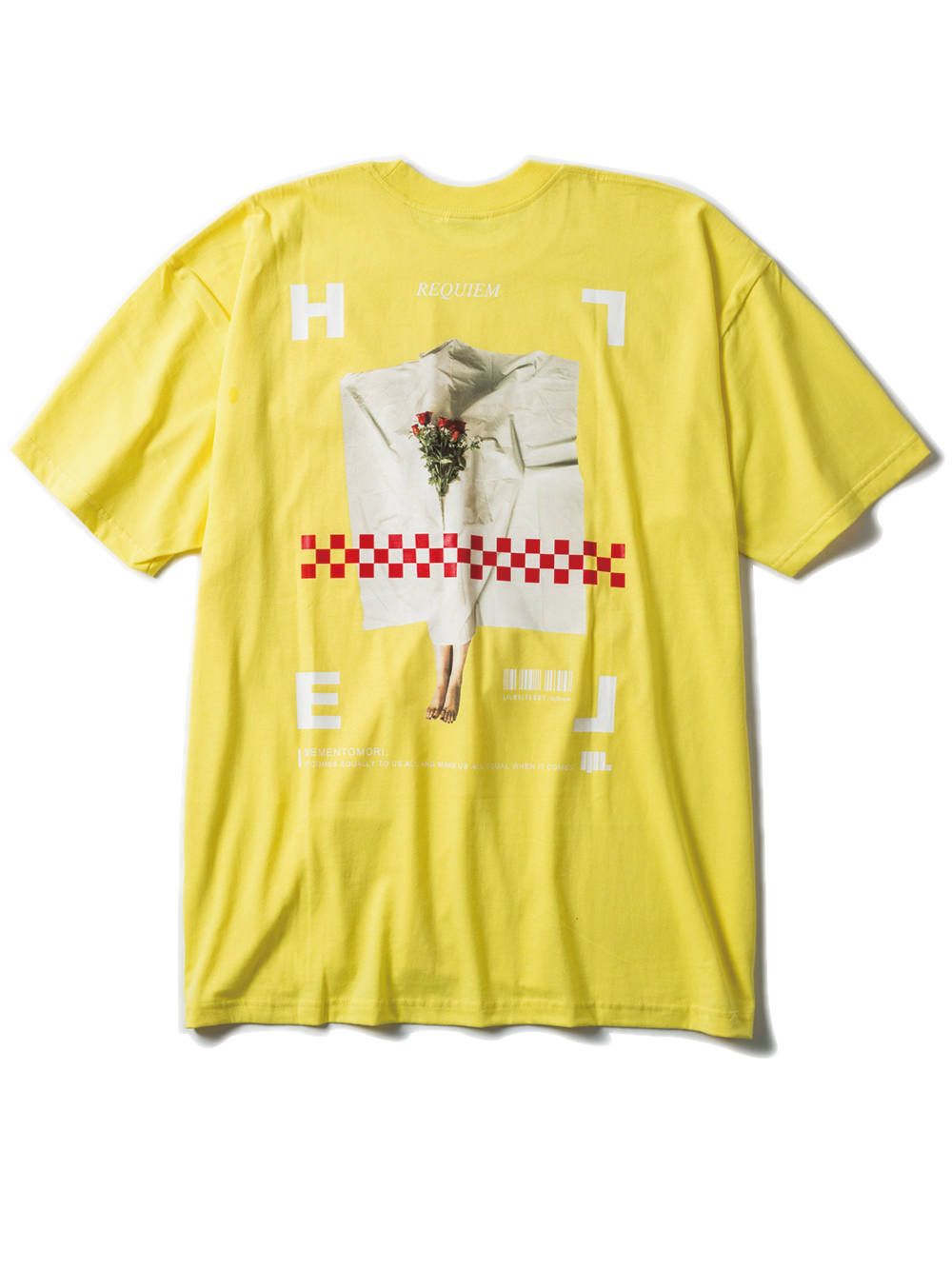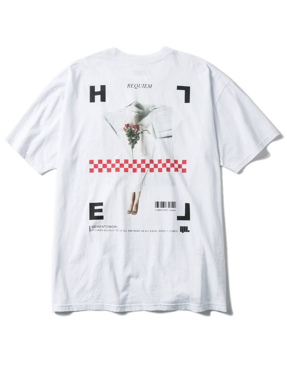 バックには布を被せられた横たわる女性と手向けられた花 フロントの”HELL IS HERE”のプリントが意味深長な一着
