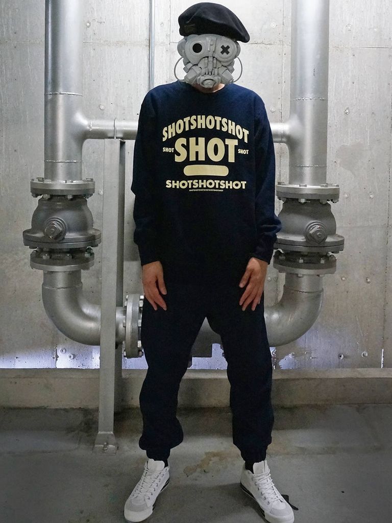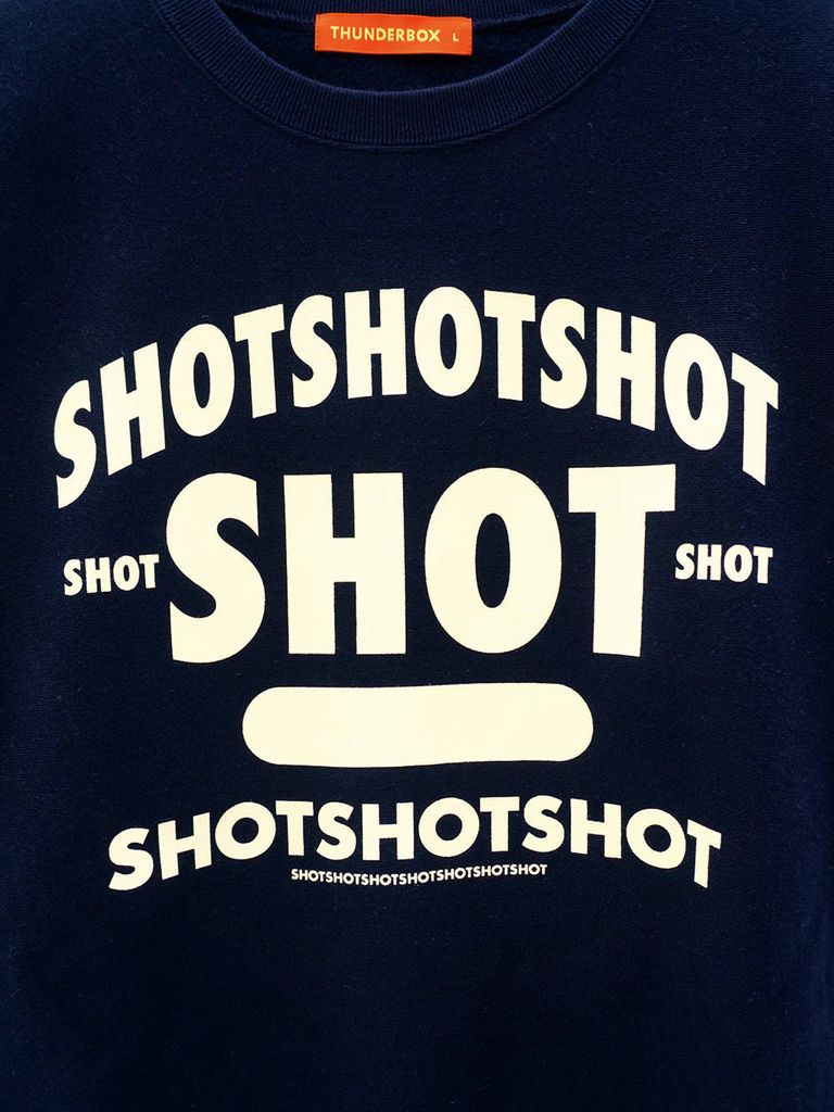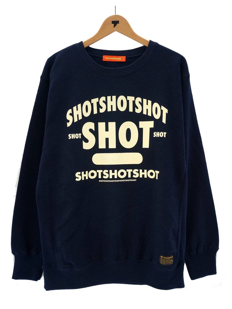 サイドのパネルをリブ編みしているリバースウィーブの ヘヴィーウェイトスウェットです。 一見カレッジ風のロゴは、よく見るとSHOTの文字が 16個で構成されています。