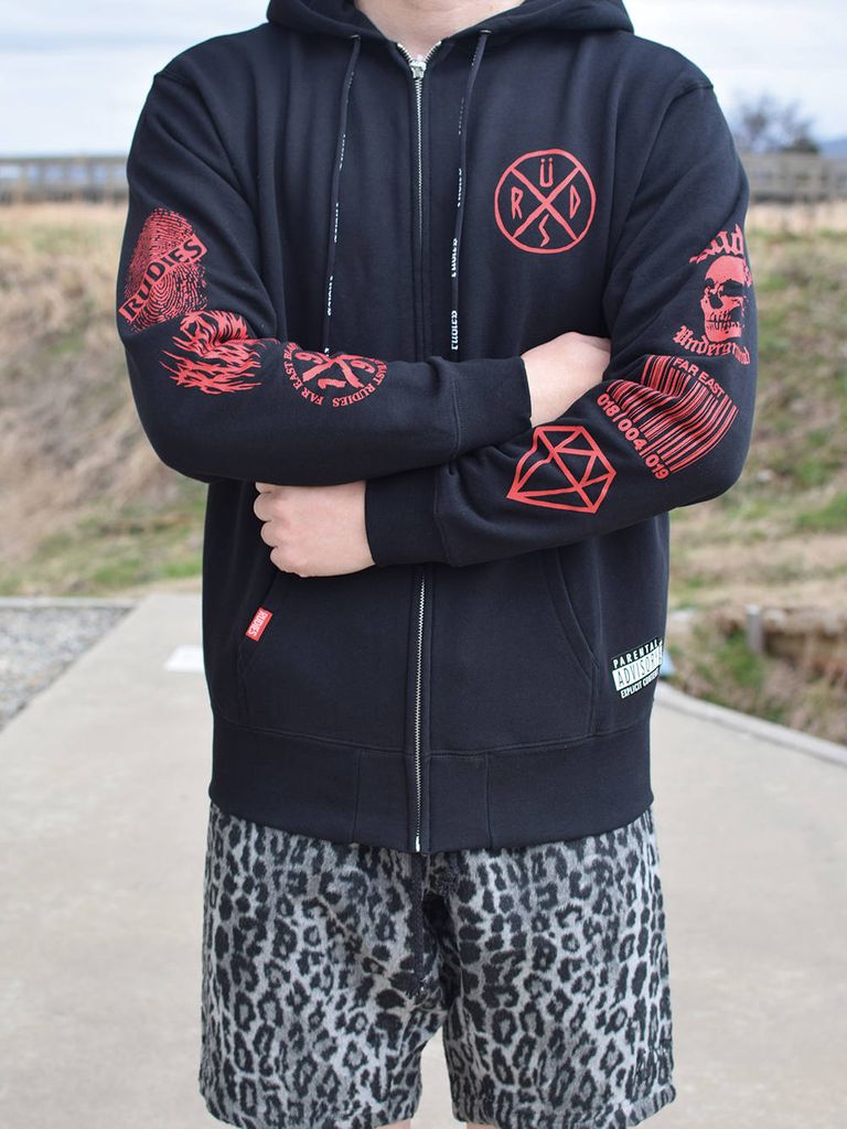 CONFUSEシリーズにジップアップパーカが登場。フロント・バック・両袖にプリントを施し、オリジナルスピンドルが付属。グラフィックが印象的なアイテムです。