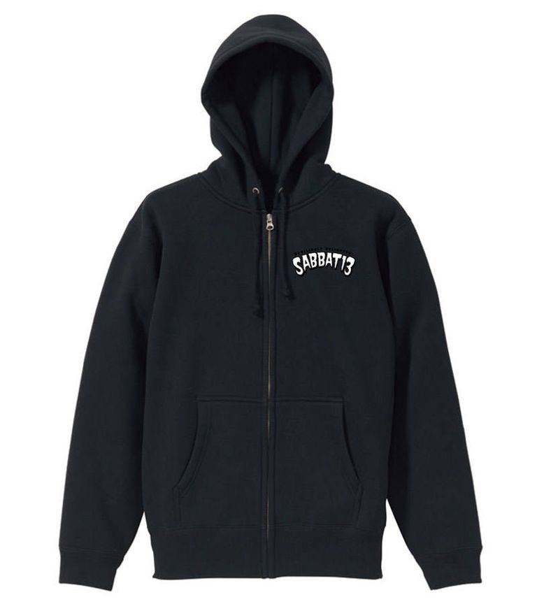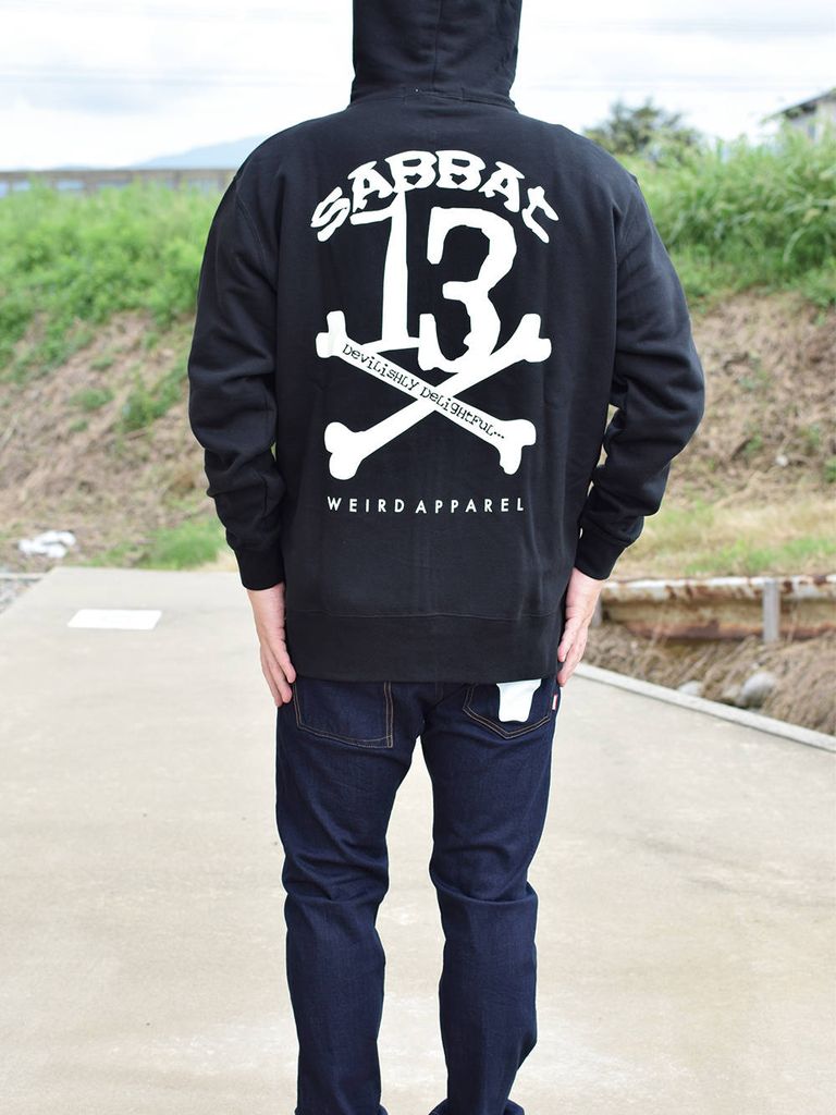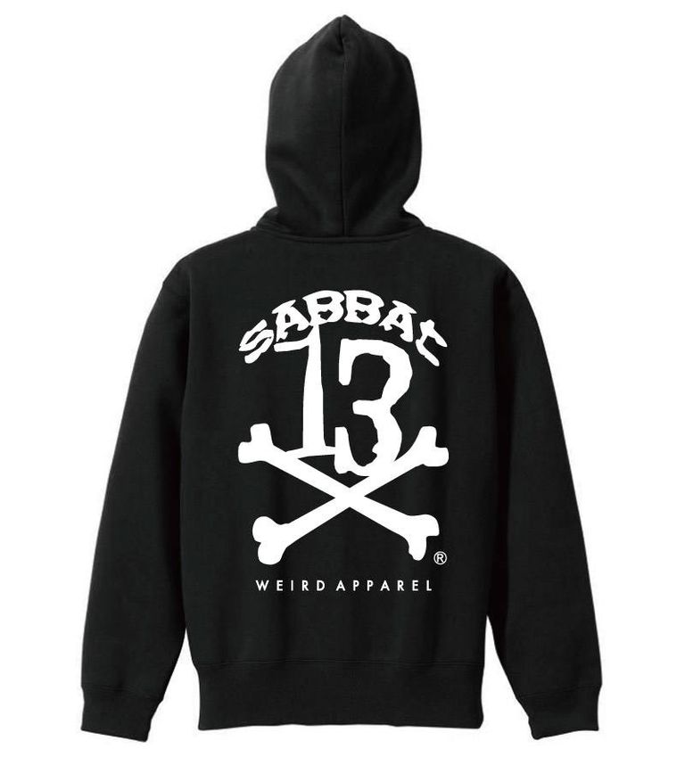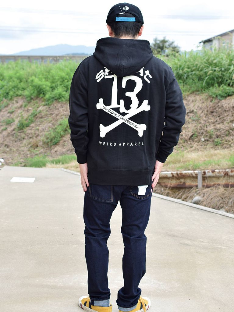 ブランドのメインアイコン「13X-BONE」をバックに大きくプリントしたジップアップパーカ。