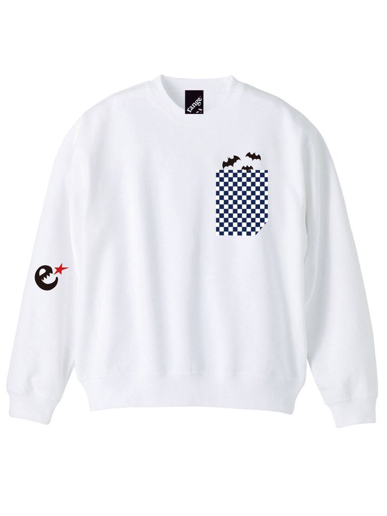 10oz 裏パイル生地。胸にはブロックチェック柄の別生地で作成されたポケットが付いてその中からバットが飛び出してくるグラフィックです。
