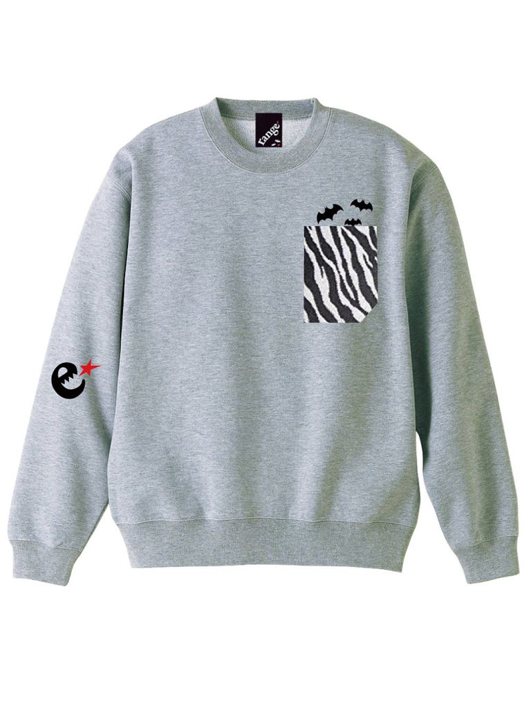 10oz 裏パイル生地。胸にはゼブラ柄の別生地で作成されたポケットが付いてその中からバットが飛び出してくるグラフィックです。