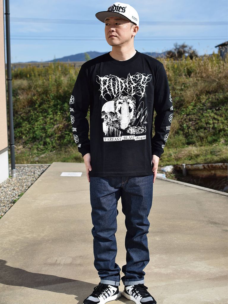 数々のアーティストのデザインを手がける Yuzuru Namiki によるアートワーク。今までリリースした作品の中から厳選されたデザイン、VULTURE・OWL・SKULL・MARIA・COBRA・PEAPER 6型がロングスリーブTシャツとなりリリースされます。ブラックxホワイトのモノクロな世界観でソリッドな印象のアイテムです。