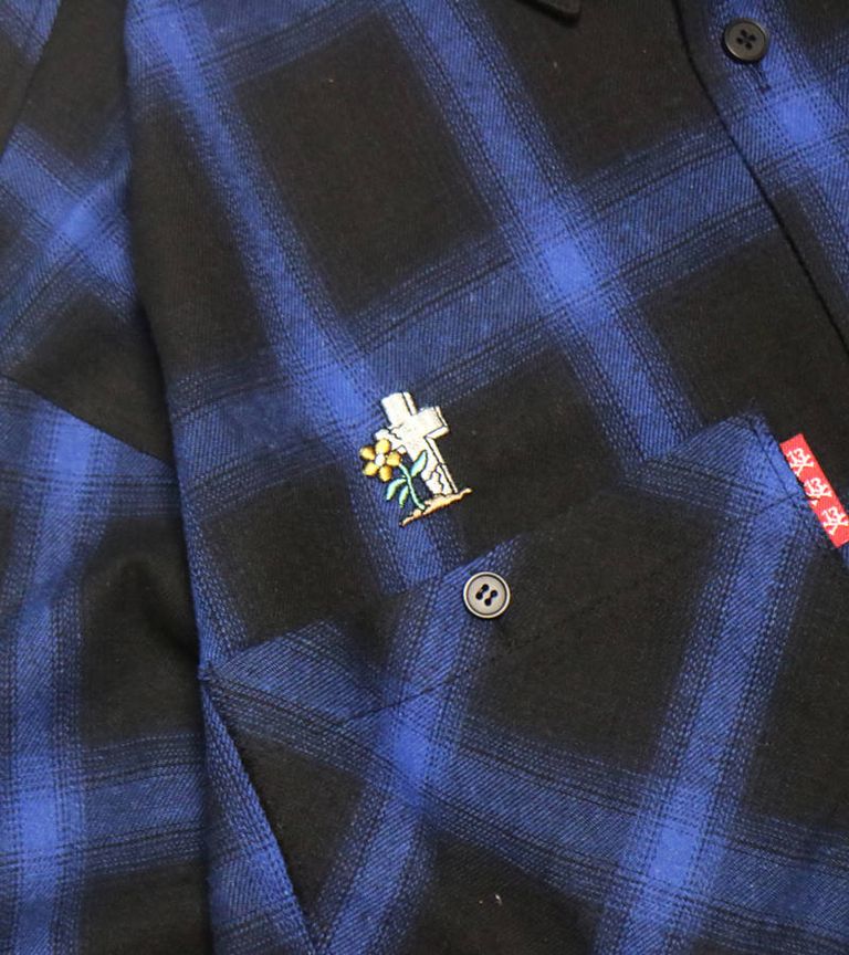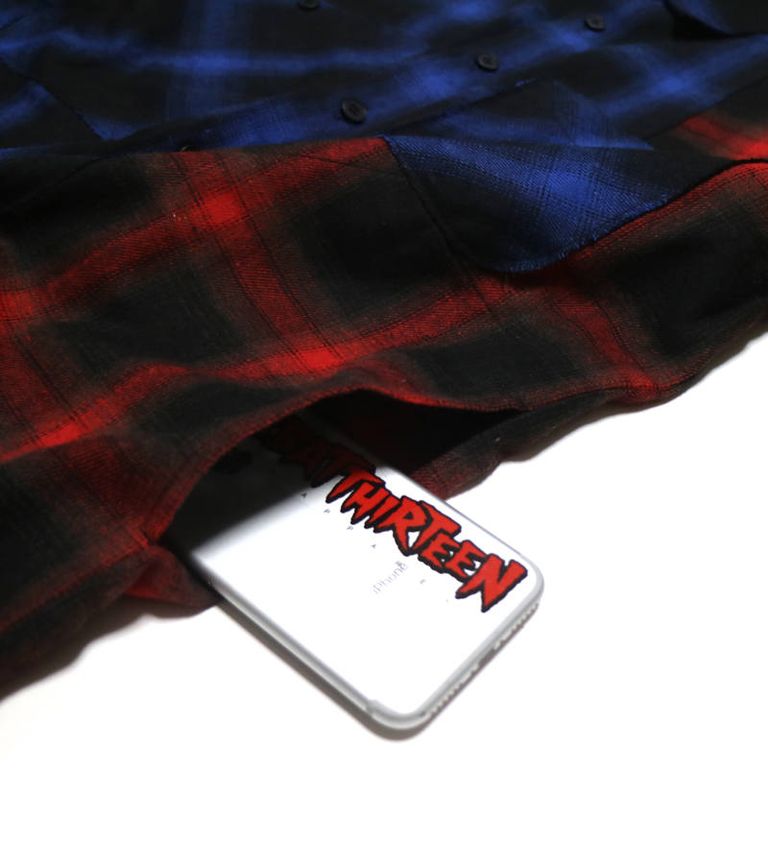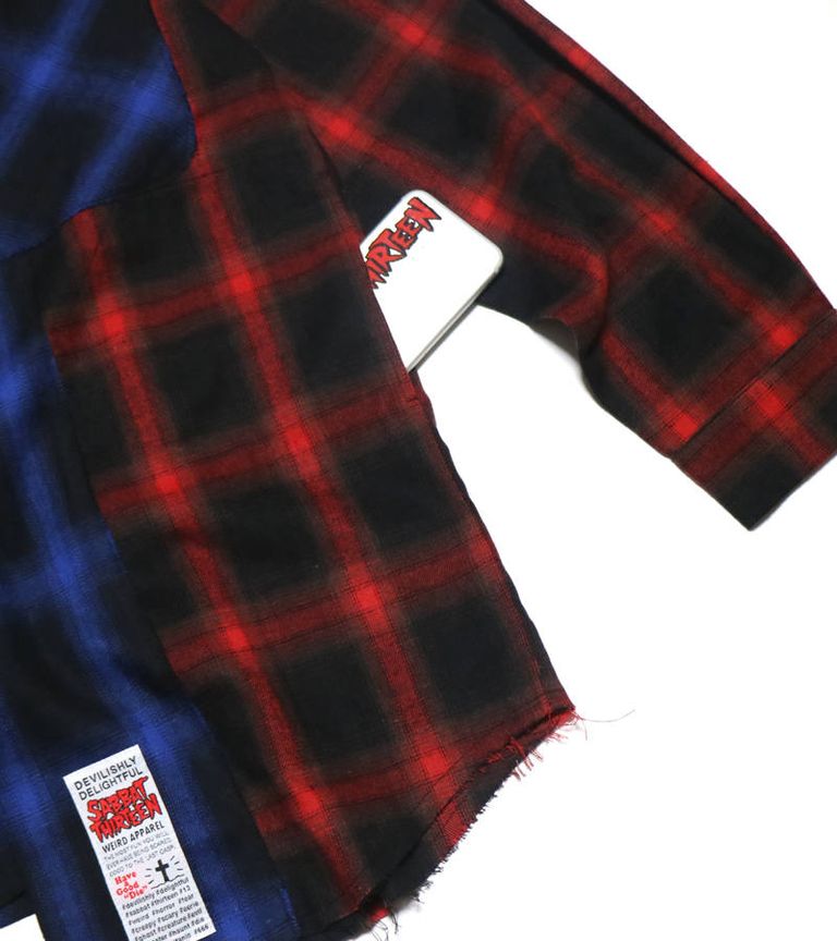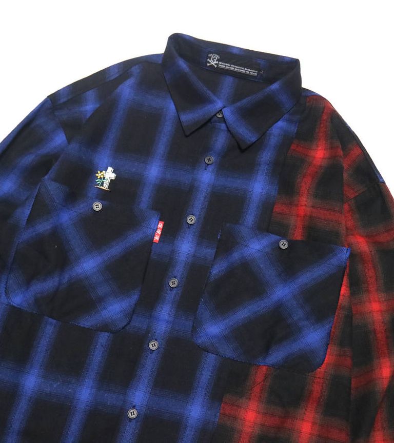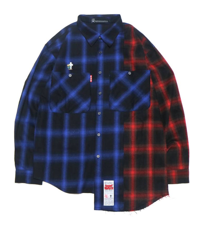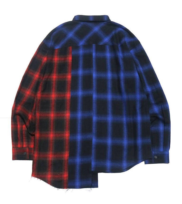 アシンメトリーな丈と配色が特徴のチェックネルシャツ。