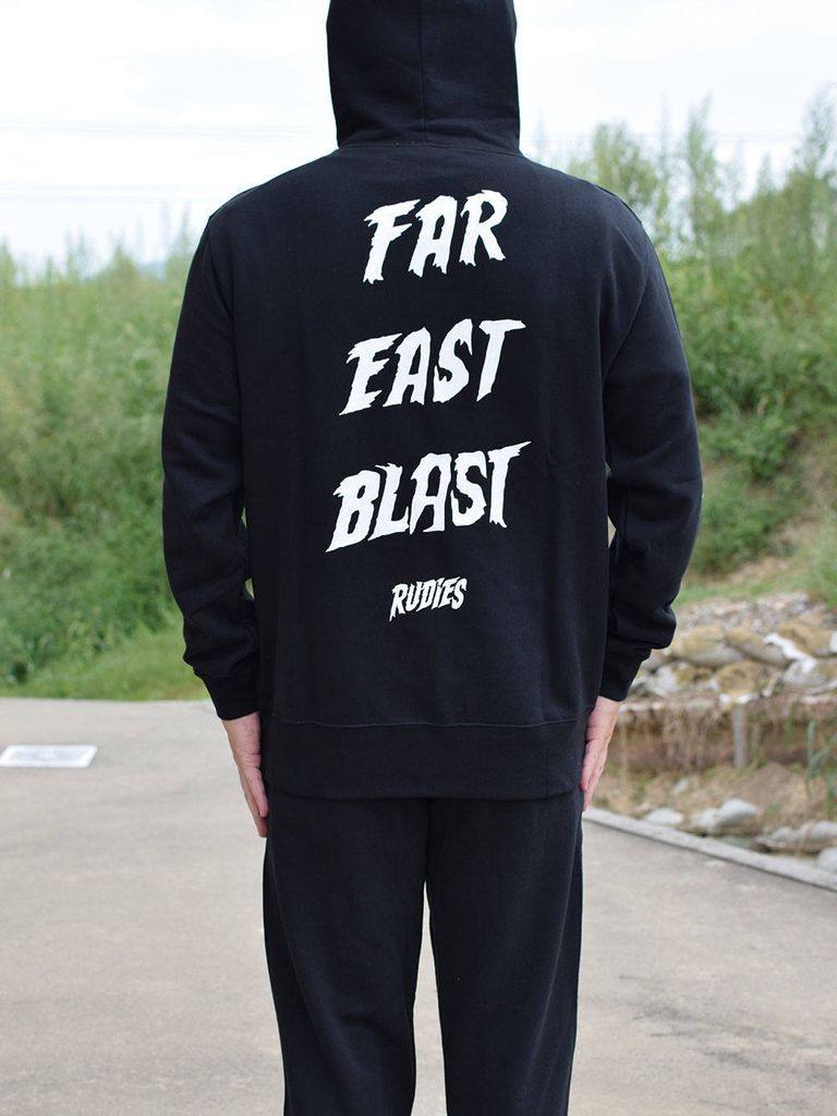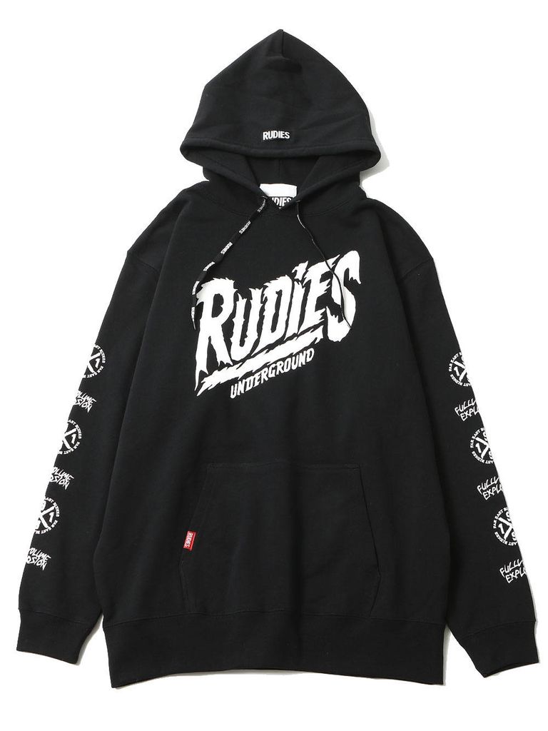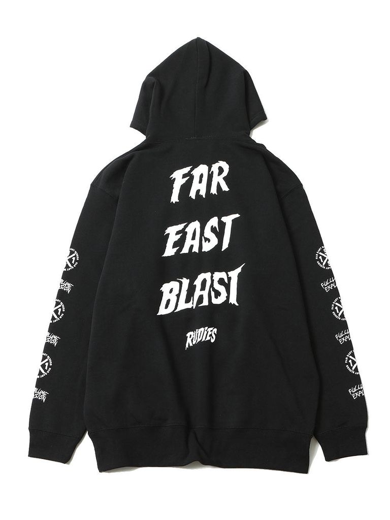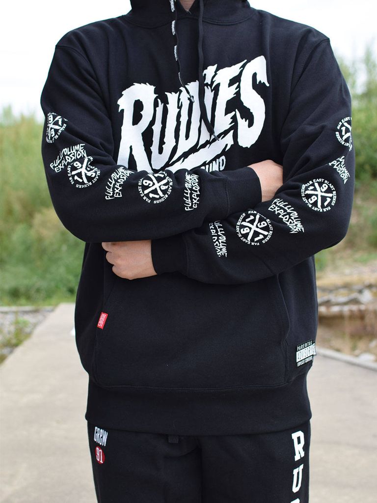 フロント・バック・両袖にプリントが施されたフードスウェット。存在感のある仕上がりでブラック・オレンジ・ホワイトの3色展開。