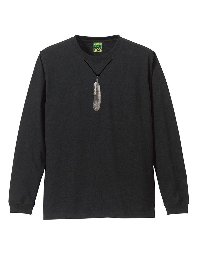 ネイティブアメリカンなフェザーのアクセが首かからかかるグラフィックがプリントされたロングスリーブT。