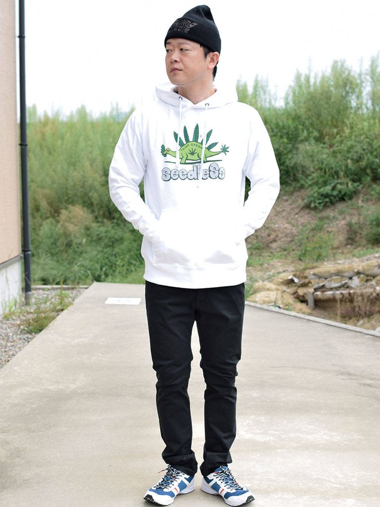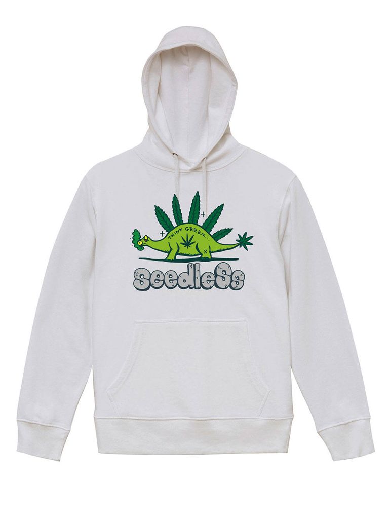 weedyな可愛らしい恐竜キャラがプリントされたプルオーバーフーディ。