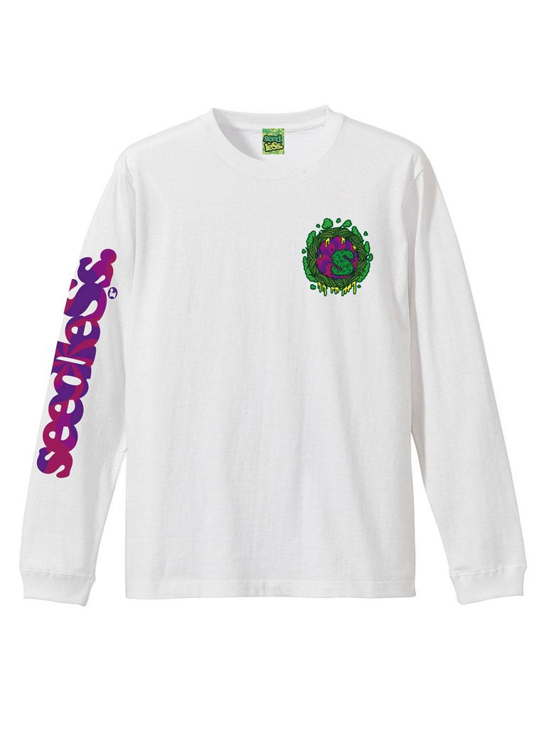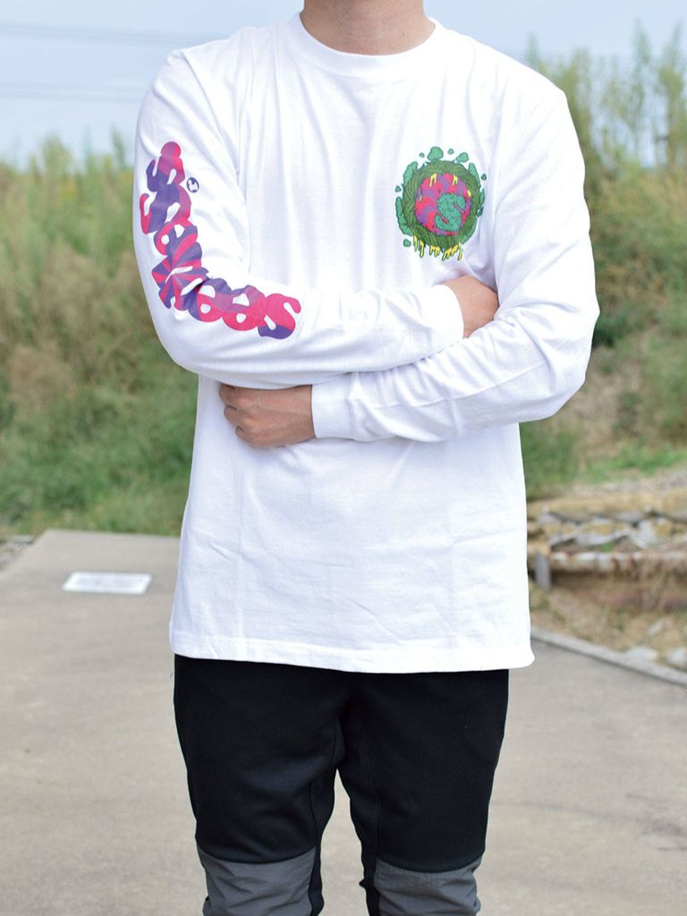 緑でサイケデリコなグラフィックが胸に、同じくサイケデリックなロゴが袖にプリントで入ります。