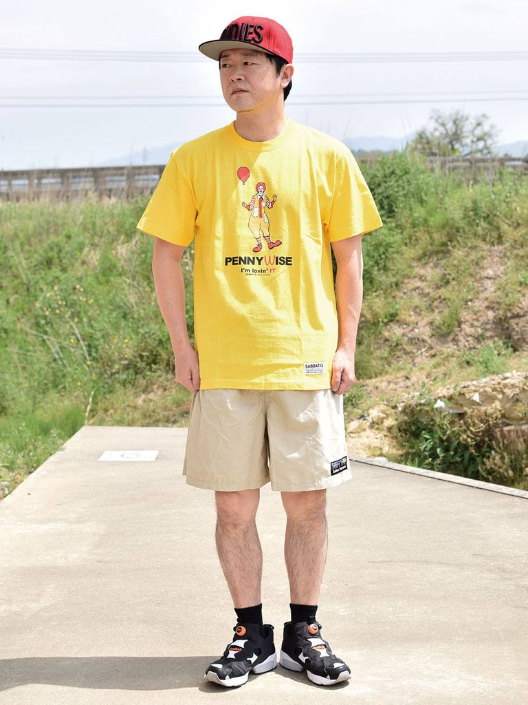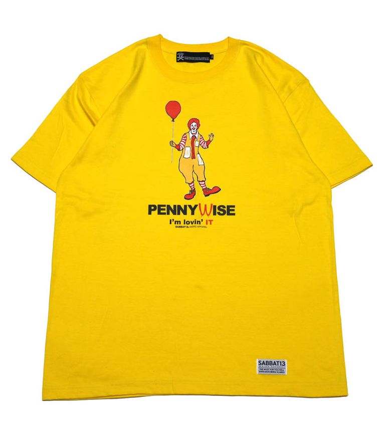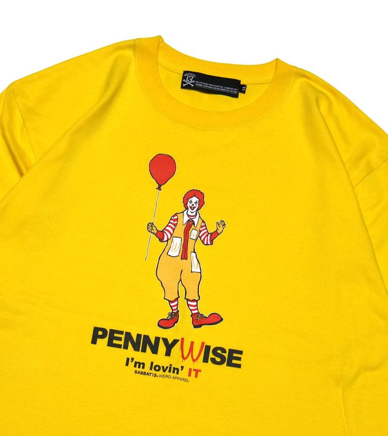 某ファーストフードショップのキャラクターが某ホラー映画のキャラクターに扮した、パロディ盛りだくさんのデザインTシャツ。