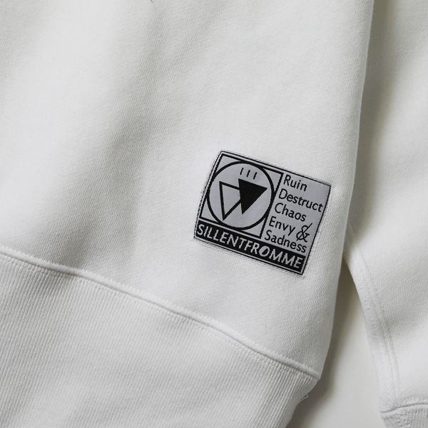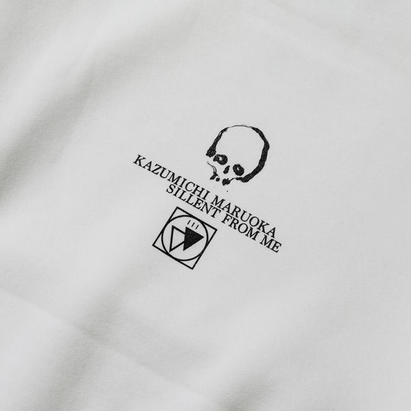 髑髏陶芸作家丸岡和吾氏とのコラボレーションデザイン。ハンドドローイングにより漢字『沈黙』を再構築したオリジナルカリグラフィを首元にプリント。バックには両者のロゴを配置。オリエンタル且つ異質な雰囲気を醸し出すアイテム。