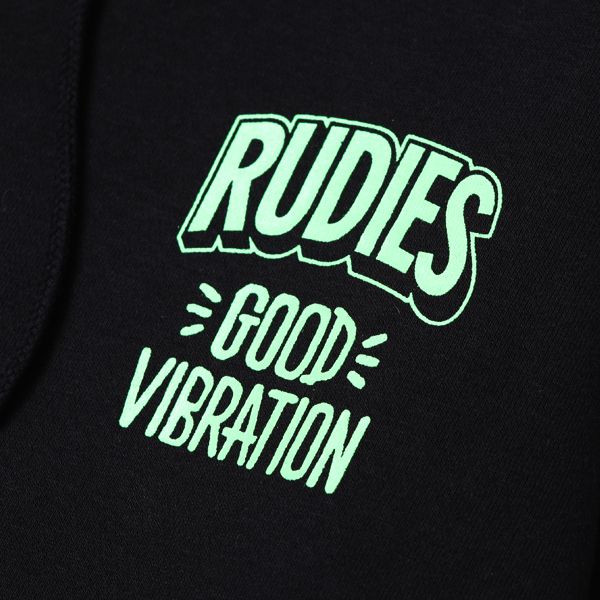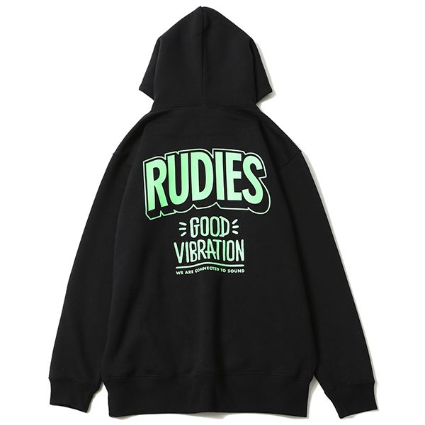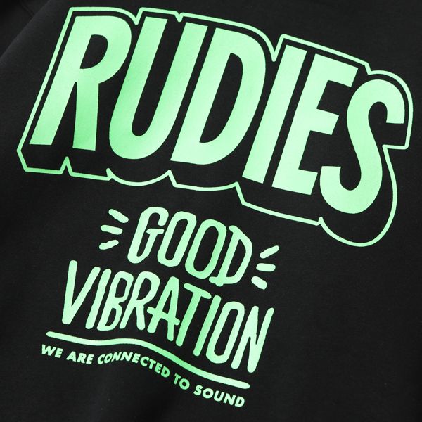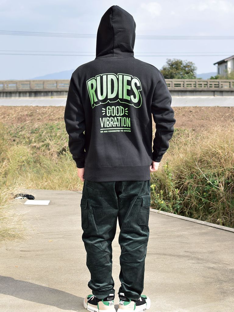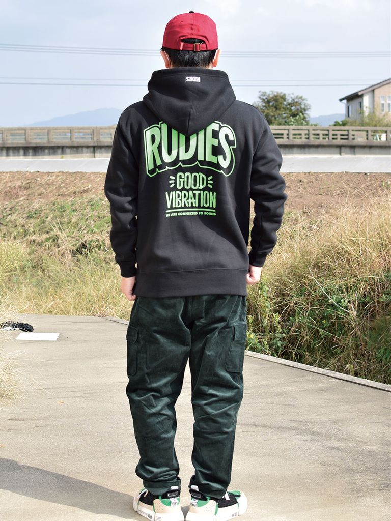 RUDIE'Sの恒久テーマの一つ、"GOOD VIBRATION"をプリントしたプルオーバーパーカーです。 ブラックボディにはネオンカラーでプリントを、また、ホワイトとオレンジの目をひくボディカラーを使用し、 力強くインパクトのある仕上がりになっています。 秋冬のダークトーンになりがちなスタイリングの差し色に、ぜひお使いください。