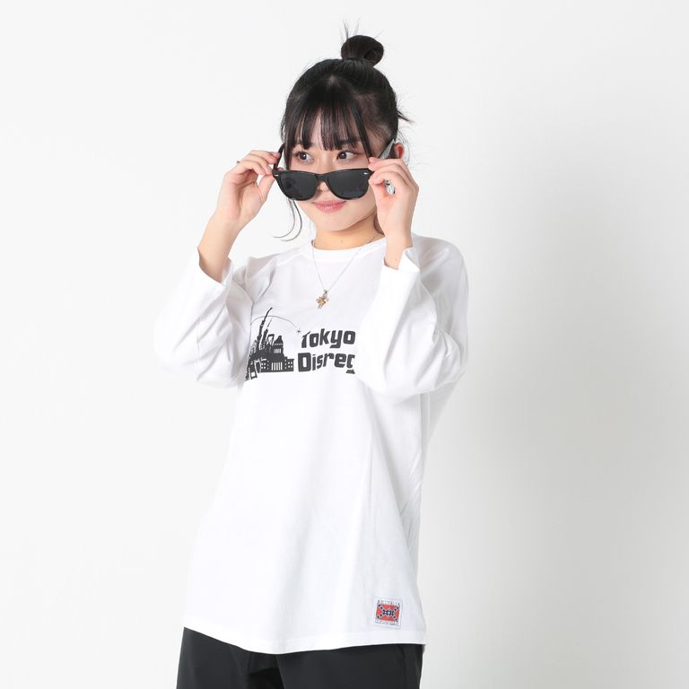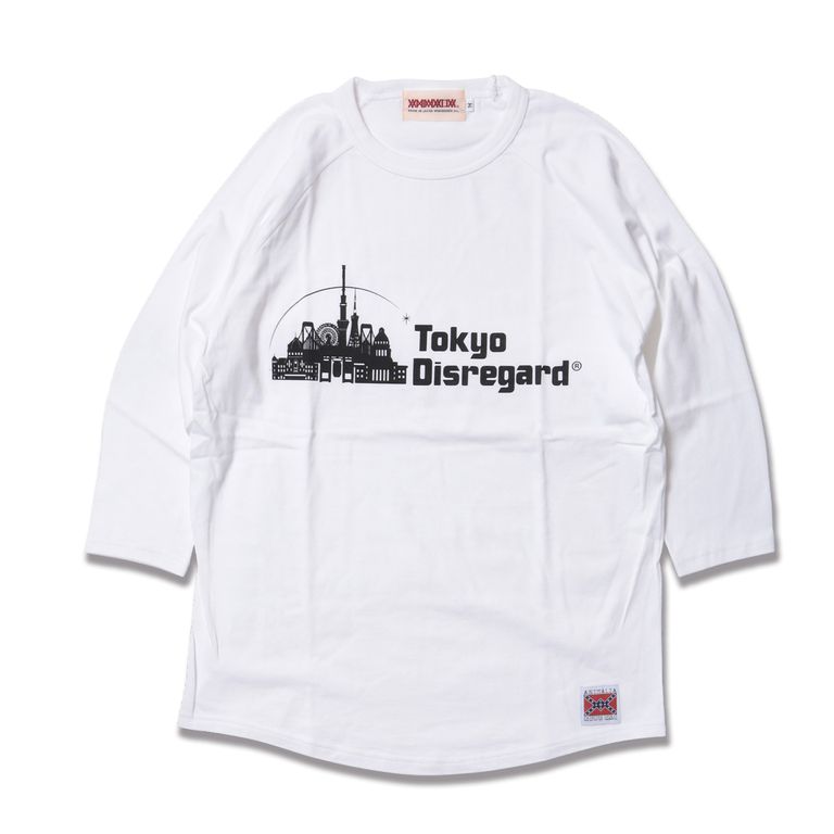 5.6オンスラグランスリーブ7分丈tee。 東京の建造物を某テーマパークのロゴを模したグラフィックです。Disregard(ディスリガード)は「無視、軽視」などの意味を持つ単語で、他人に無関心なあまり人情が希薄になってしまった東京の姿を表しています。