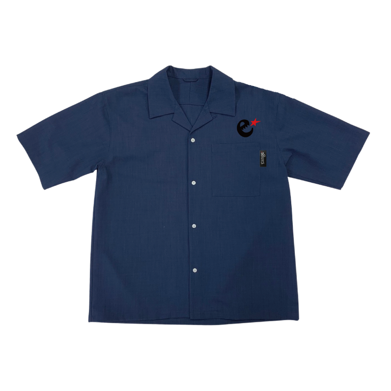 ポリエステルのシャンブレー生地が大人カッコいい雰囲気を生む開襟シャツ。