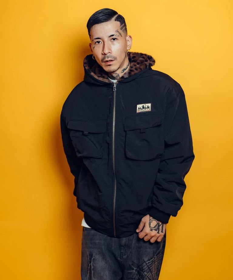 リップストップ面はマチ付きフラップポケットをフロントに配備し、木々やネイチャーカラーをあしらった刺繍ワッペンをポケット上にオン。アウトドアウェアをイメージしたデザインに仕上げました。レオパード柄ファー面には玉縁ポケットを配備し、左胸にメインロゴ『THE BASE』を刺繍。