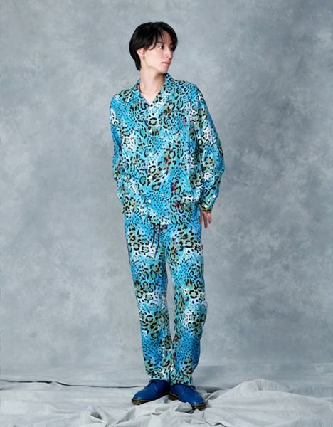 レーヨン素材のセットアップ。インパクトあるレオパード柄が存在感抜群。オープンカラーでリラックスしたスタイリングに。