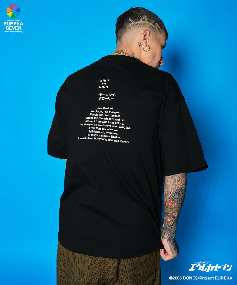 フロントには手を伸ばすエウレカとニルヴァーシュ、バックにはタイトルと印象的なセリフをプリントで施しました。