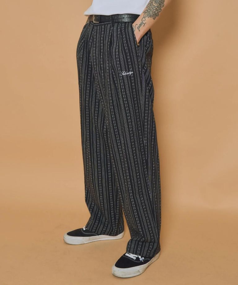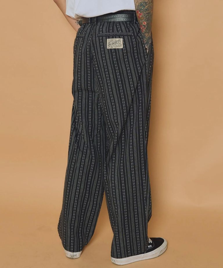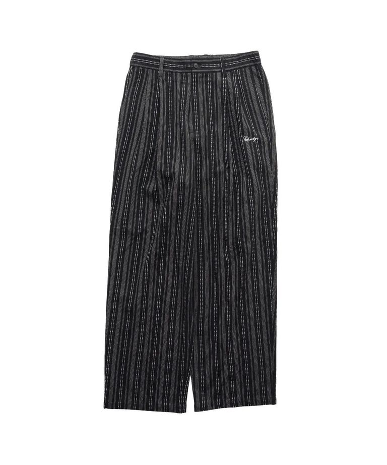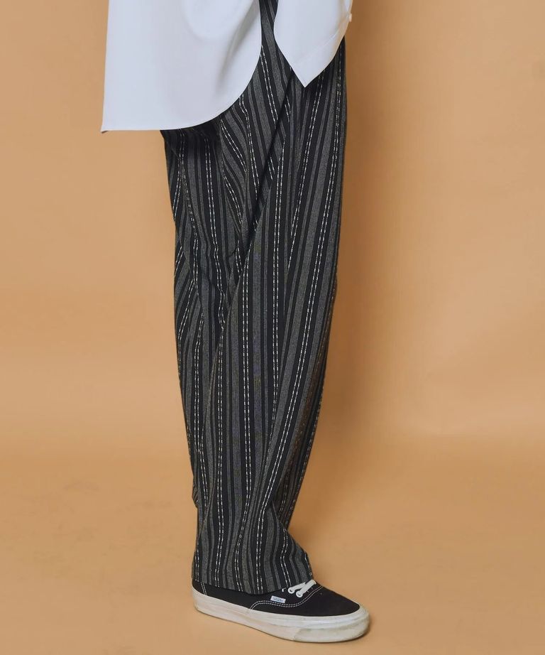 ストライプ柄のジャカード生地を採用したワイドシルエットスラックス。糸の太さ、線の種類や本数の異なる3種のストライプ模様をジャカード織りで表現した生地を採用。