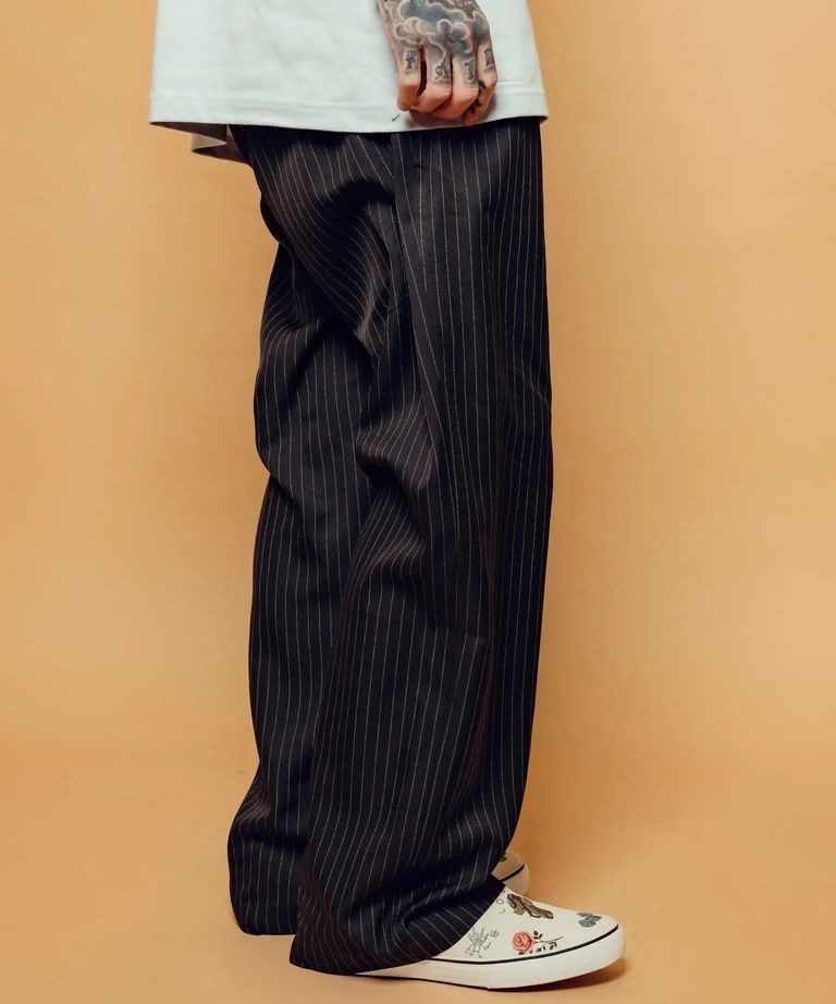 フロントは利便性の高いジップフライに変更、ヒップポケットのフラップを削除し、ツータック、ワイドシルエット等のディテールは継承。太めのわたりから、ストリートらしさも残した綺麗なテーパードシルエット。