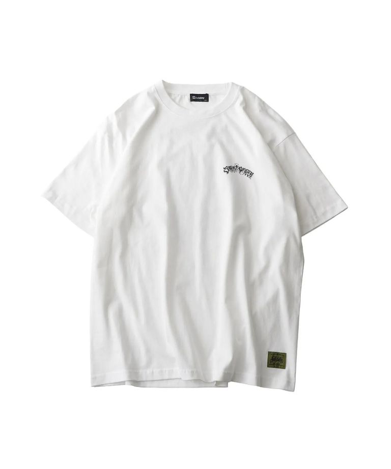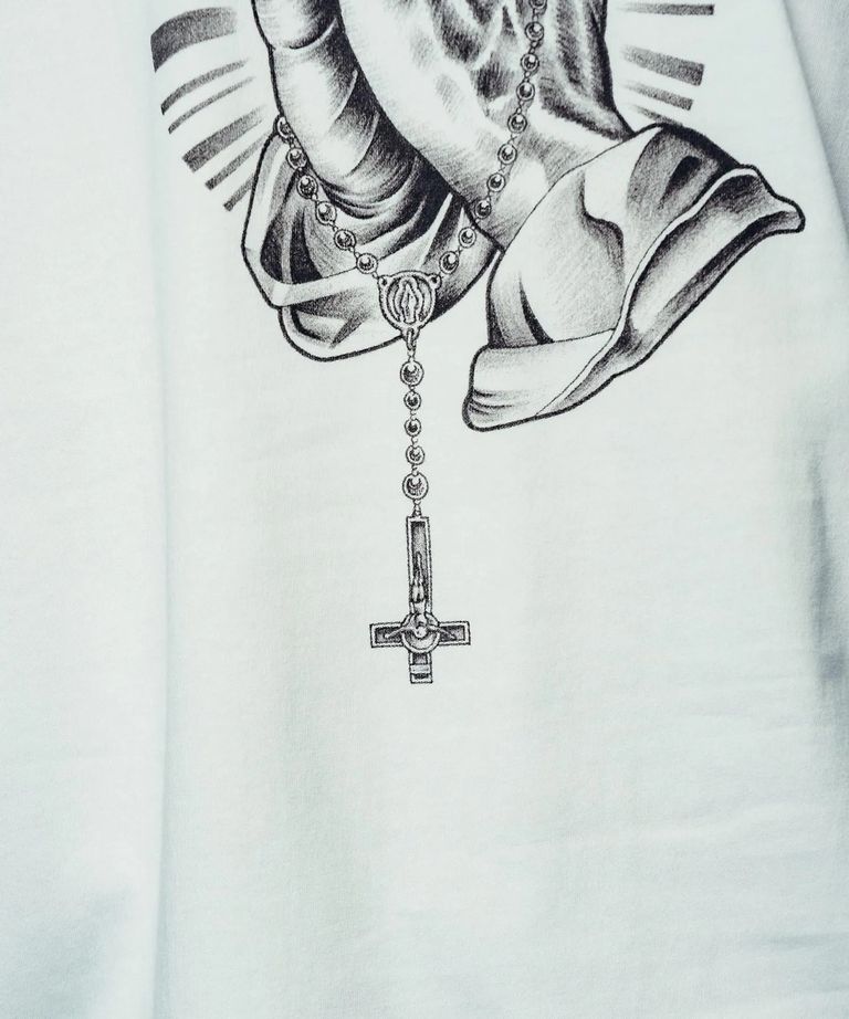 6.2オンスのコーマ糸天竺生地を採用。フロントには『SAINT ANGER』のタイポグラフィ、バックには片手で祈り、片手で中指を立てる反骨の手をプリントで施しました。