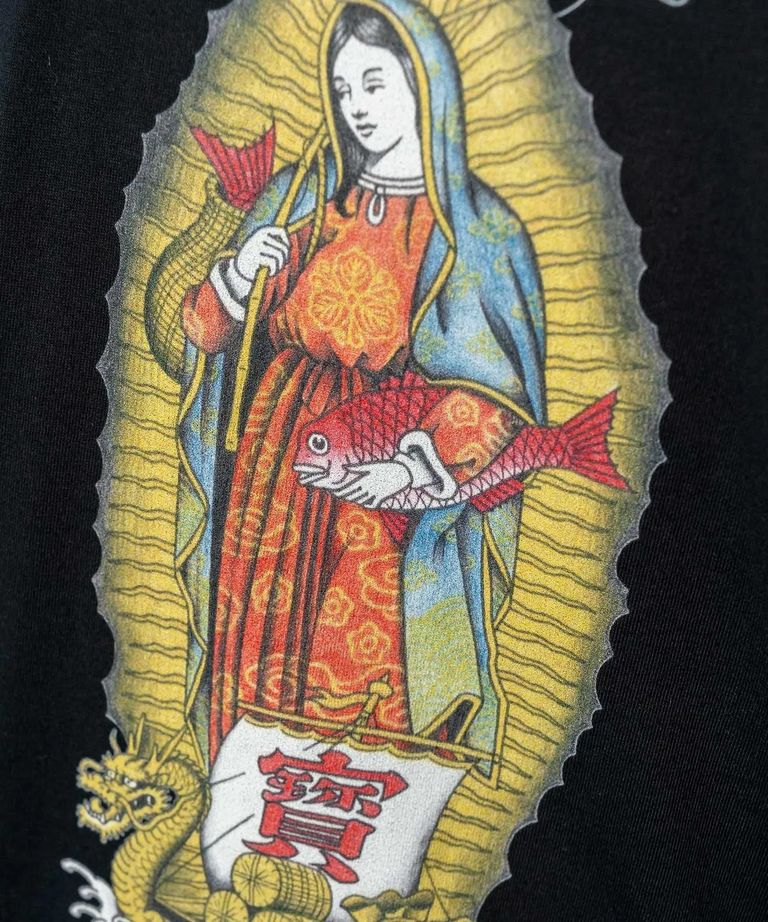 左胸にはメインロゴ『THE BASE』、バックには七福神の一柱で、日本古来の漁業・商業・五穀豊穣の神様である恵比寿様の衣裳を着用したマリアをプリント。
