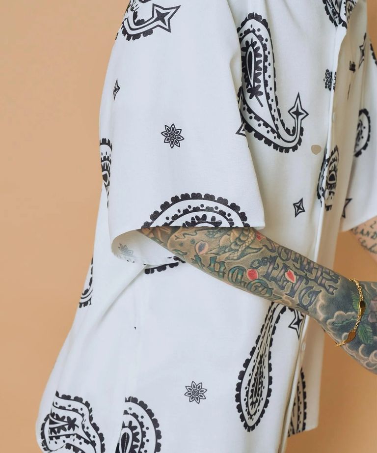 ペイズリー柄プリントのボックスシルエットオープンカラーシャツ。トラディショナルな開襟シャツのディティールを残しつつ身幅や肩幅、アームホールにゆとりを持たせたリラックス感のあるボックスシルエット。