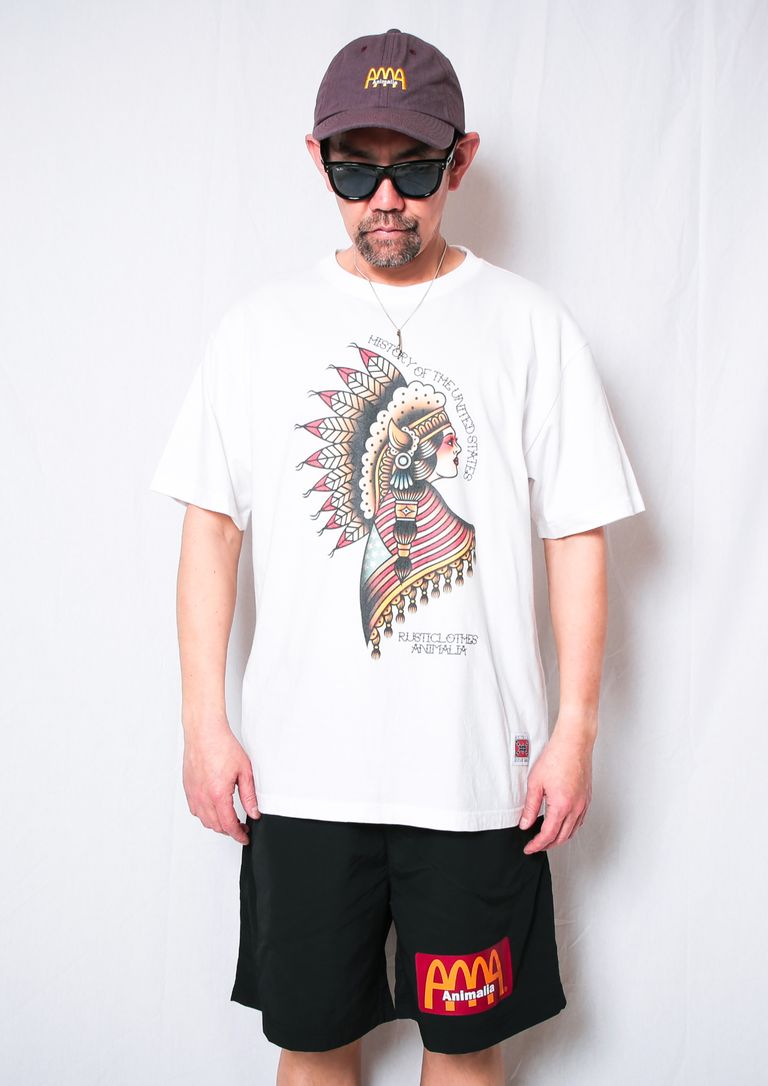 ネイティブアメリカンの象徴「War Bonnet」(ウォーボンネット)と星条旗を纏った女性をTraditional Tattoo風に描いたANIMALIAらしいグラフィックが入るモデル。