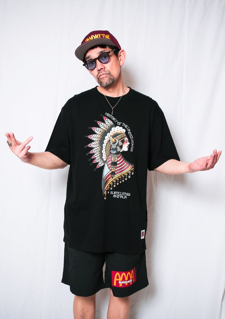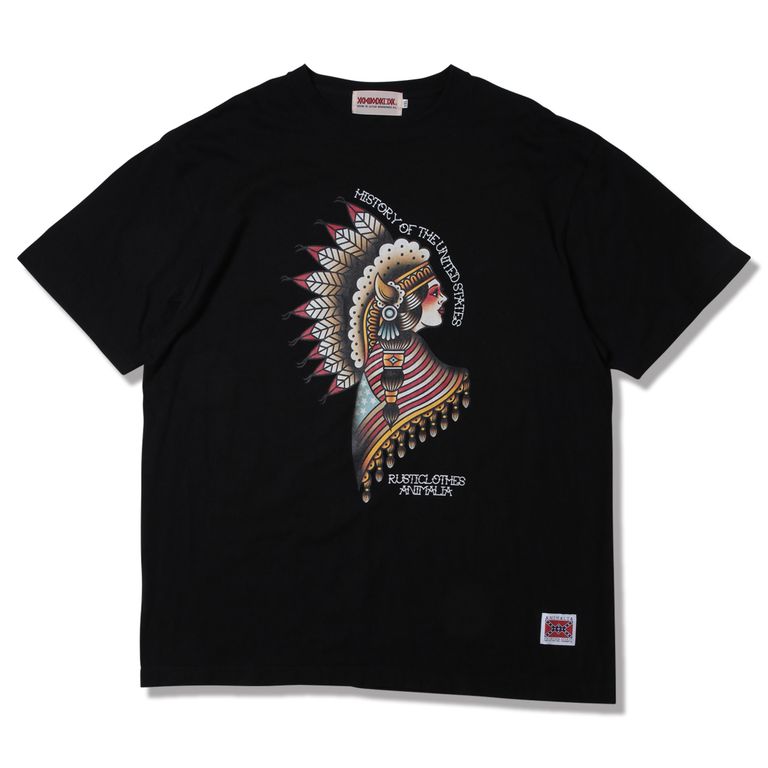 ネイティブアメリカンの象徴「War Bonnet」(ウォーボンネット)と星条旗を纏った女性をTraditional Tattoo風に描いたANIMALIAらしいグラフィックが入るモデル。