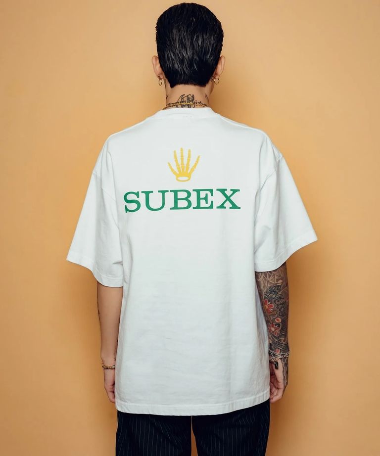 左胸、バックにはスカルハンドの冠を携えたロゴをプリントで施しました。ざっくりとした生地感のオープンエンド糸の7.1オンスの天竺生地を採用。