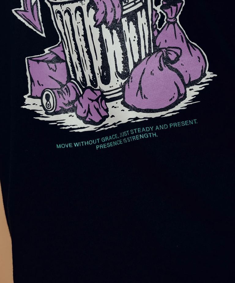 フロントにはゴミ箱の中から小銭を見つけ出した悪魔のグラフィックをプリントで施しました。