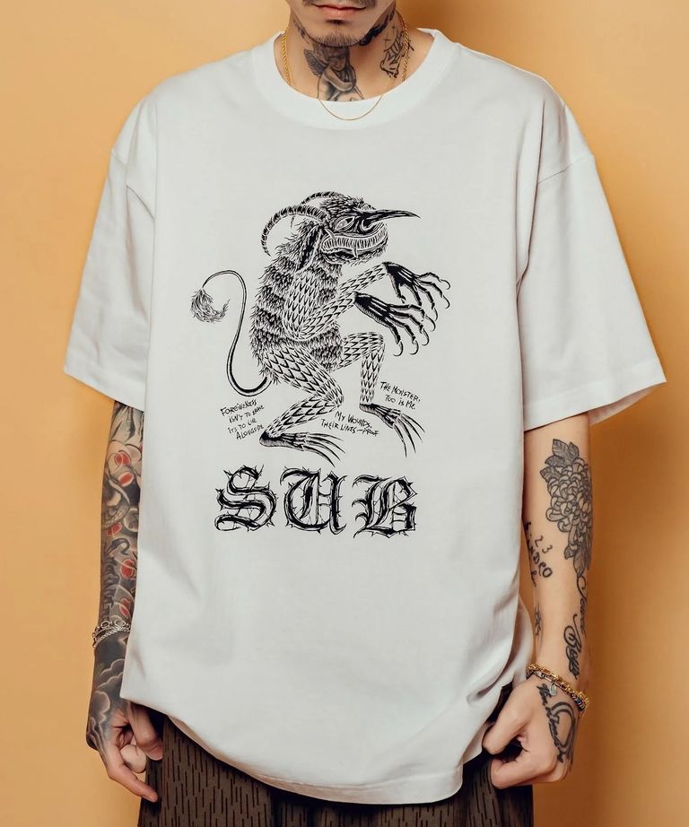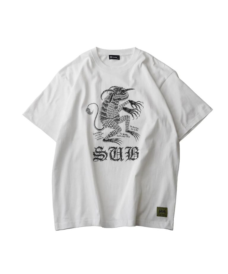 フロントには悪魔をプリントで施しました。抜き足差し足で歩く悪魔を己のコンプレックスの象徴として描き、自らに棲まう陰鬱な部分を赦し生きることが自らを形成することであることを表現。