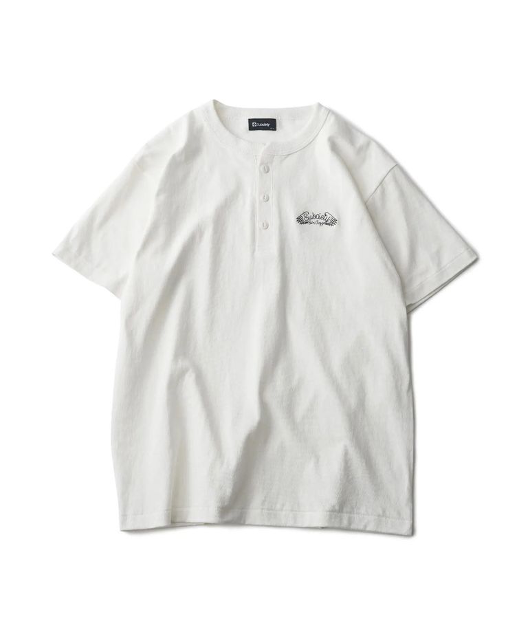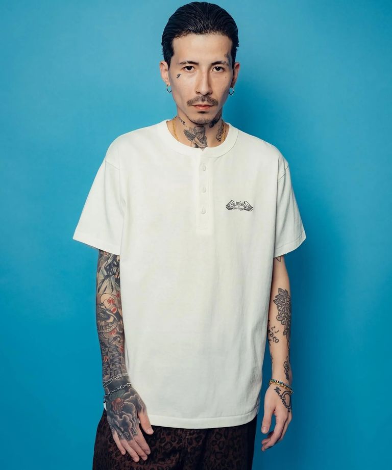 6.2オンスのザックリとした生地感の天竺生地を採用。猫目ボタン、太めのバインダー仕様のネックなどアメカジスタイルには欠かせない一着。左胸にはGoin' crazyの刺繍を三角ステッチ刺繍で施しました。