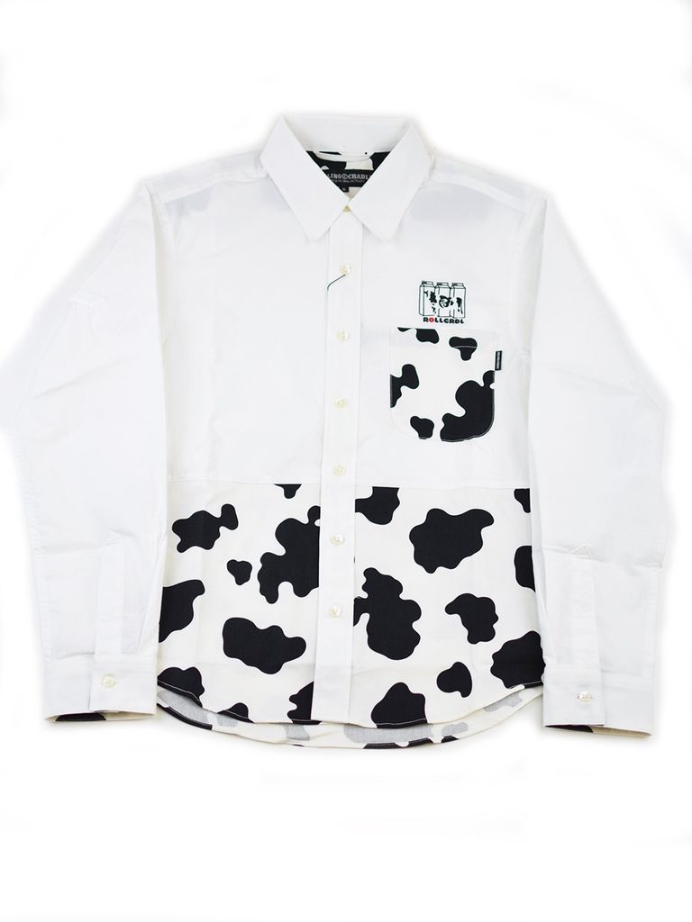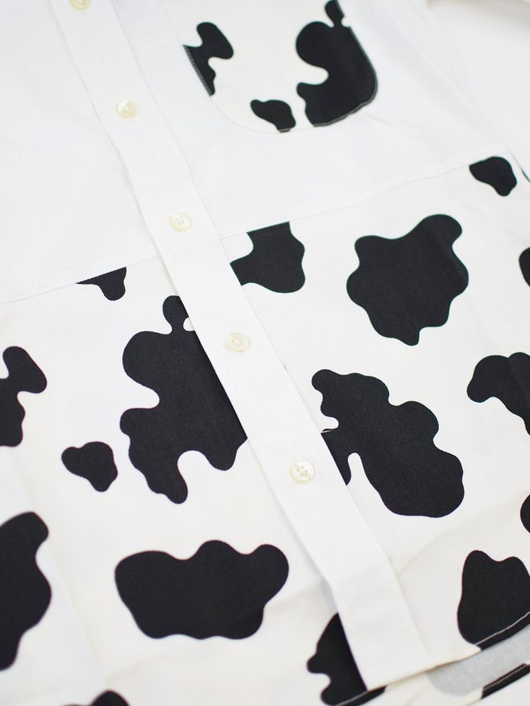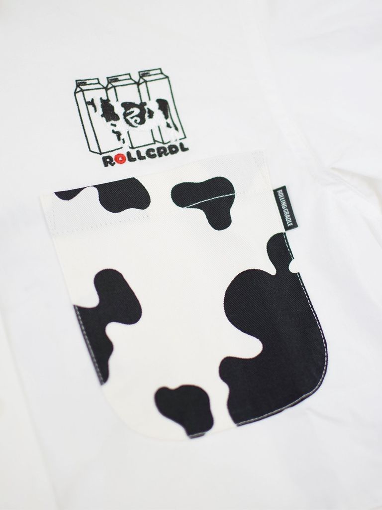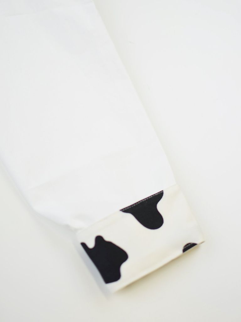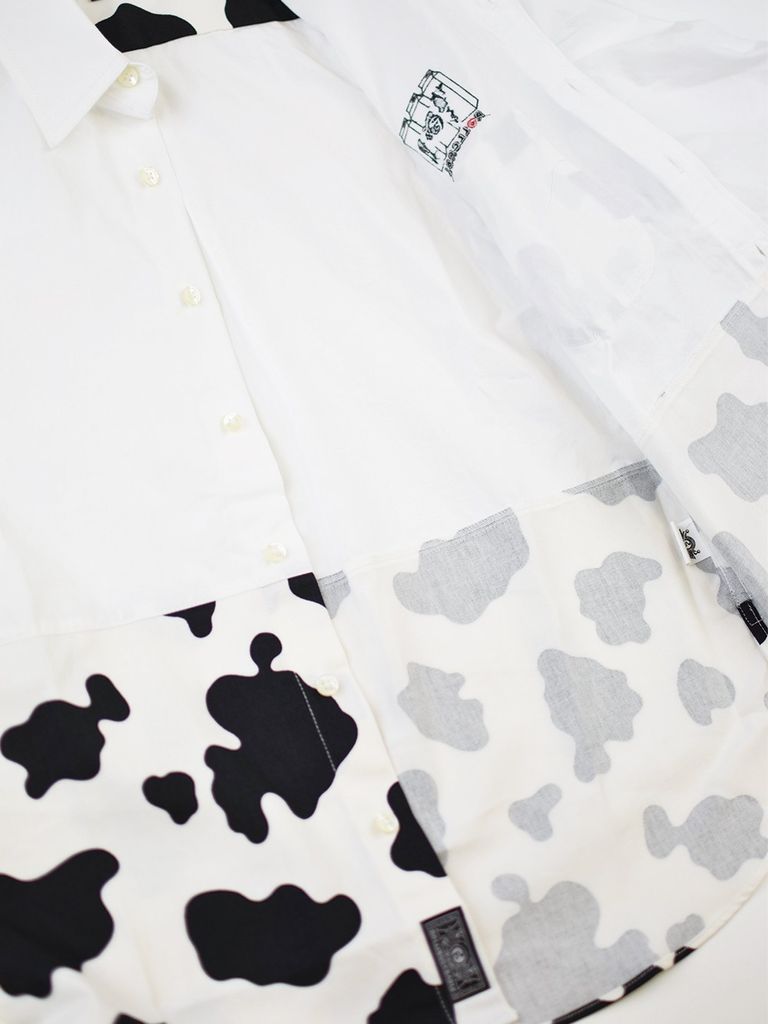 ホルスタイン柄のテキスタイルを使用したシャツ。胸元のMILK&COWの刺繍もポイント。