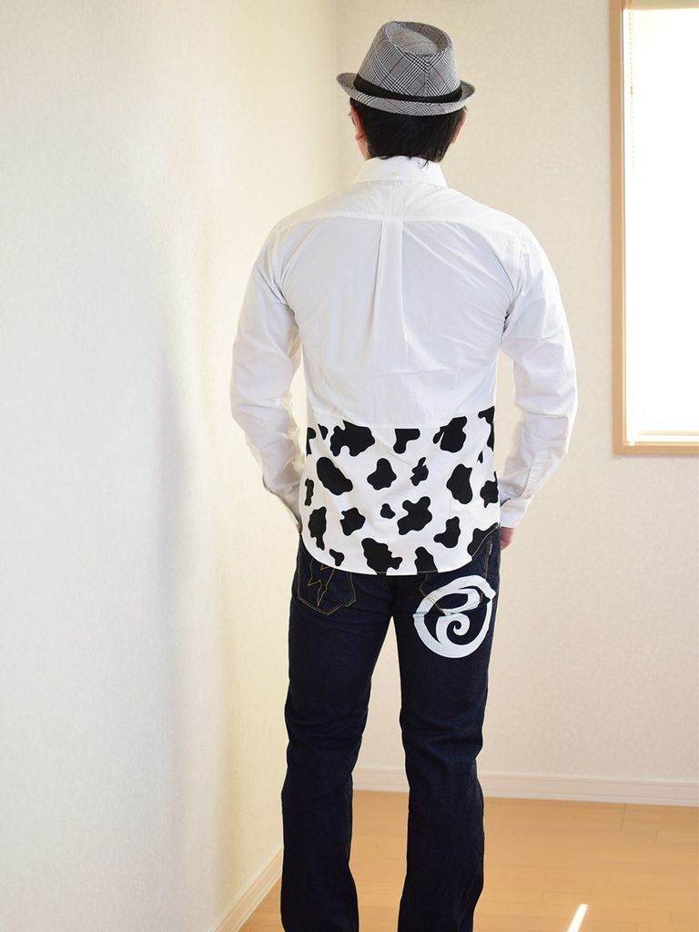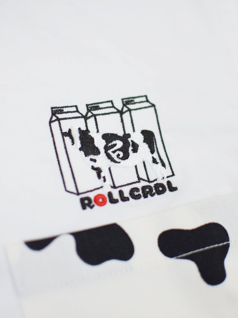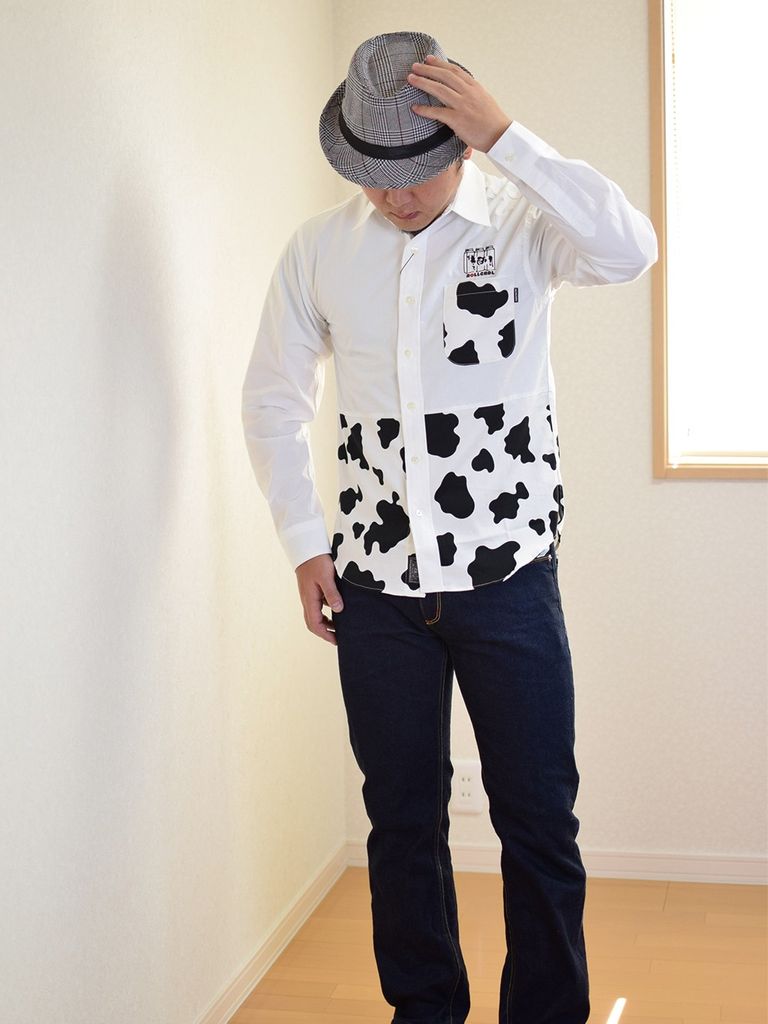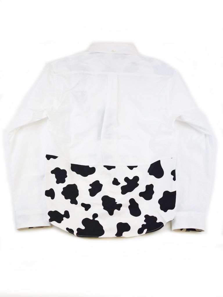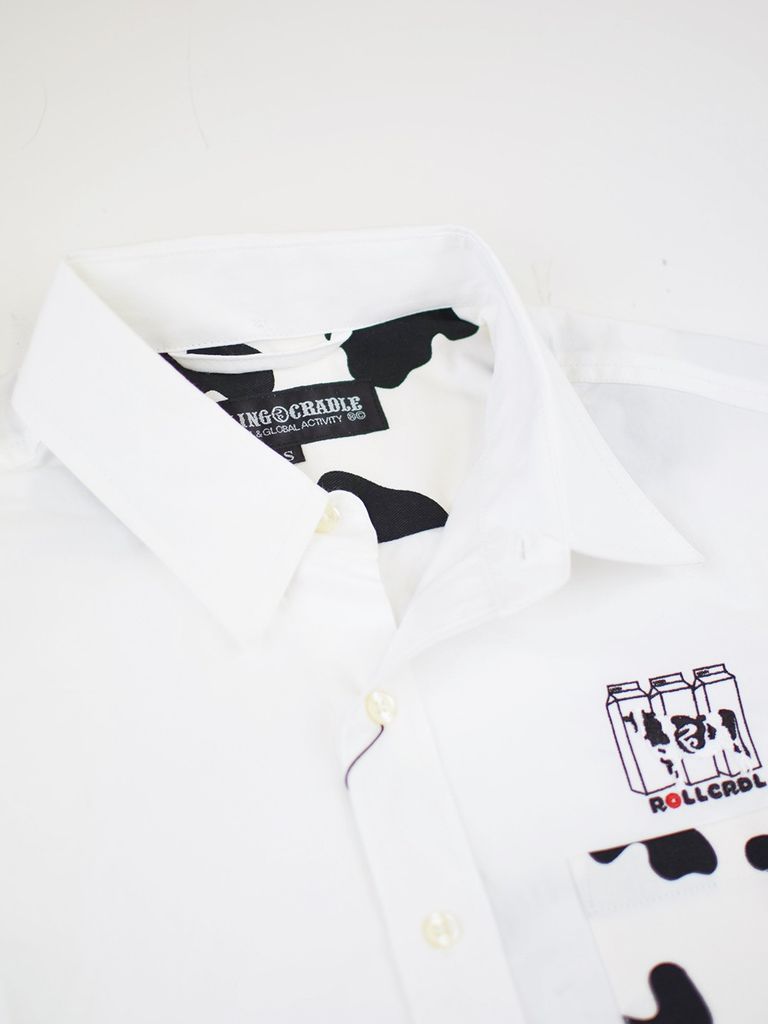 ホルスタイン柄のテキスタイルを使用したシャツ。胸元のMILK&COWの刺繍もポイント。